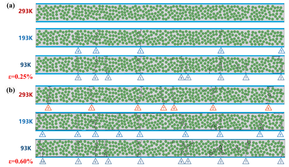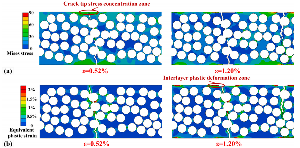 随后,研究基于宏-细观多尺度计算分析模型,进一步探讨了超低温对损伤行为的影响机制,研究结果表明基体裂纹受基体性能与热应力的综合影响,低温下树脂基体强度的提升会减缓基体开裂,而基体模量增加、热应力等因素对基体裂纹和层间开裂起促进作用;基体的低温韧脆转化是分层损伤的主要因素,室温下基体的塑性变形可以有效抑制分层裂纹的扩展(图4),低温下基体转化为线弹性导致分层损伤加剧。