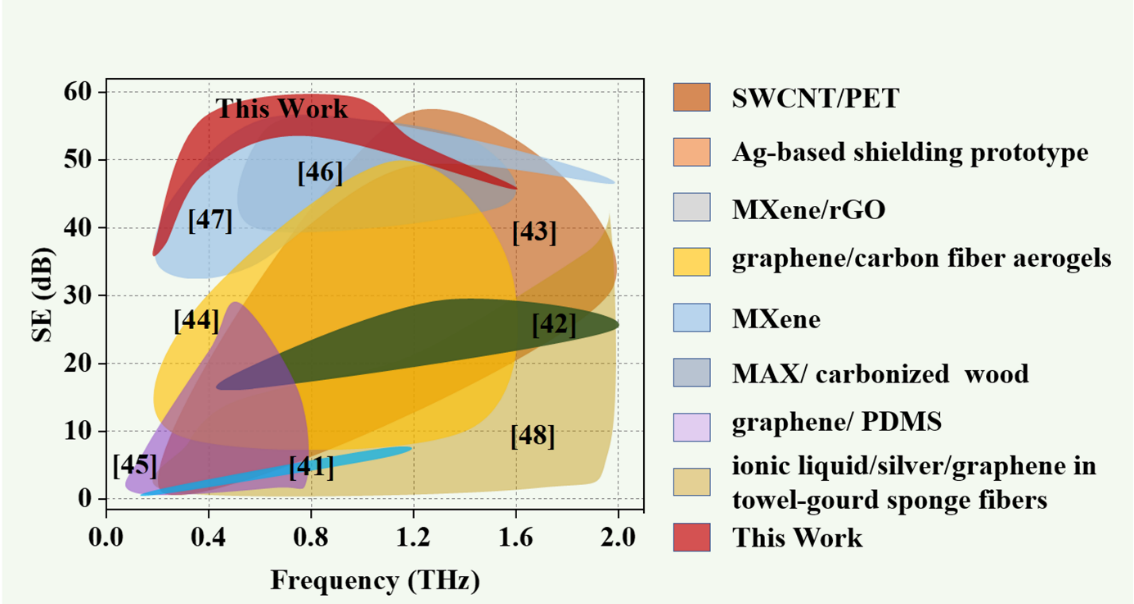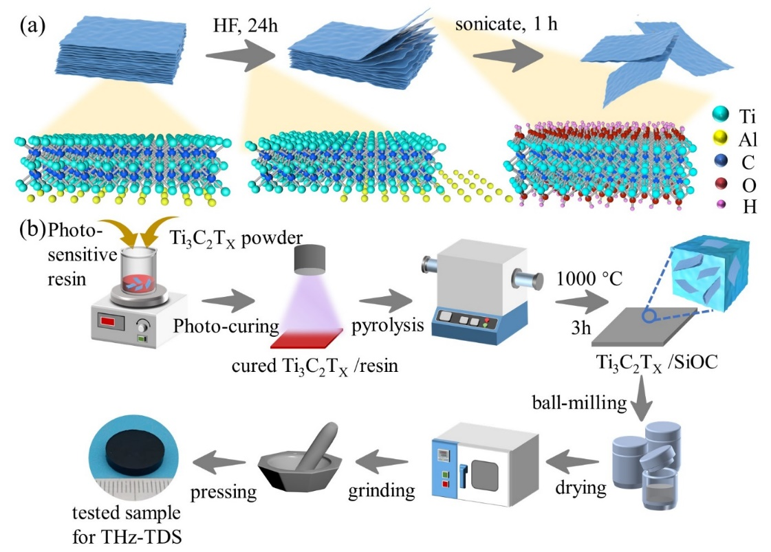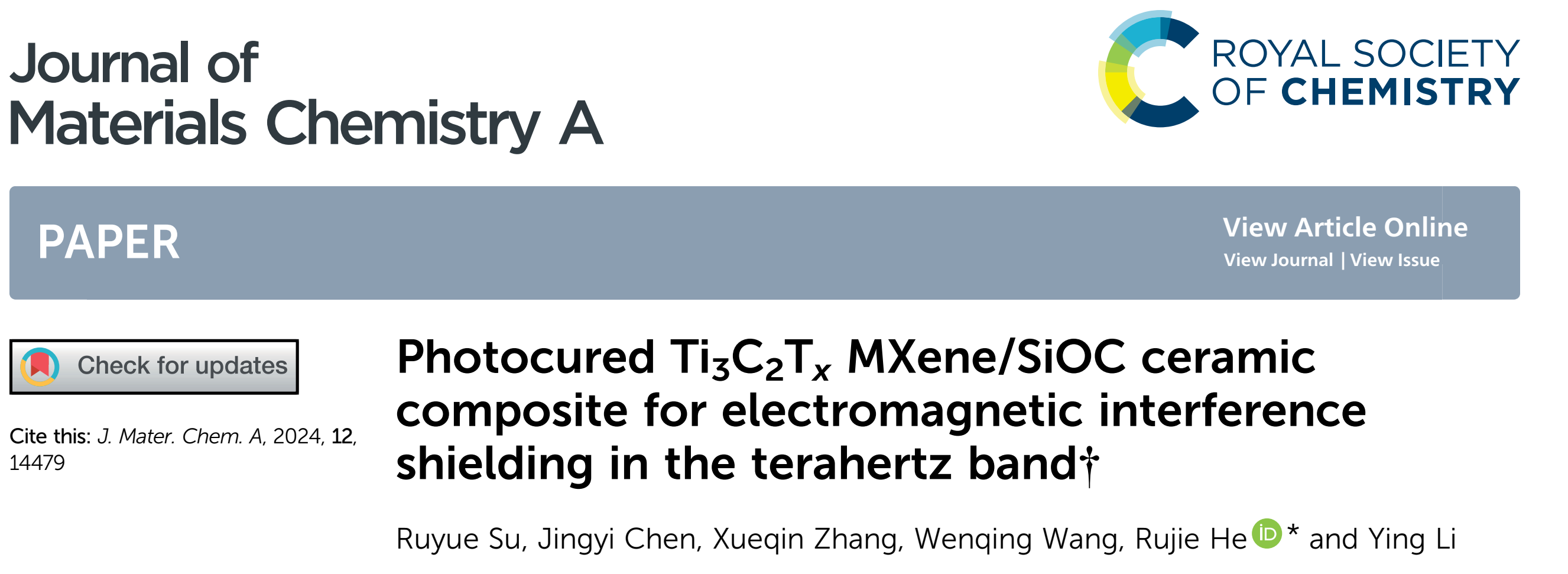 接下来,为了优化PDC-SiOC陶瓷的太赫兹屏蔽性能,团队优化合成了可光固化的Ti3C2Tx MXene/SiOC(MSiOC)陶瓷复合材料。采用丙烯酸改性的环氧硅树脂为前驱体,加入经酸刻蚀获得的MXene粉体,经405 nm波长紫外光固化、真空裂解后得到了MSiOC陶瓷复合材料。MSiOC陶瓷复合材料内部由异质材料交错组成的“三明治”结构,有利于对电磁波的衰减,从而呈现优异的电磁屏蔽性能。相关研究成果以“Photocured Ti3C2Tx MXene/SiOC ceramic composite for electromagnetic interference shielding in the terahertz band”为题发表于材料领域顶级期刊、英国皇家化学会期刊《Journal of Materials Chemistry A》(IF=10.7,https://doi.org/ 10.1039/d4ta02495h),并入选为hot article。