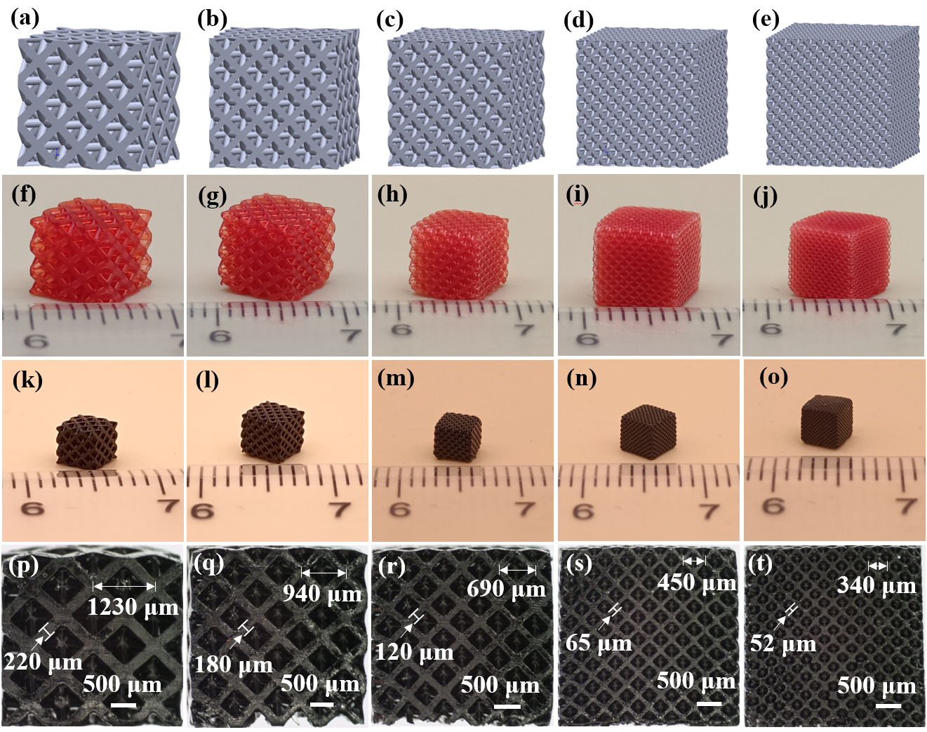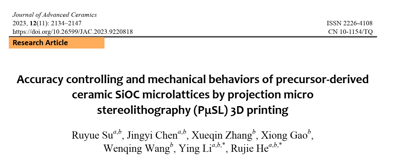 首先,如何实现前驱体转化陶瓷(PDC)的高精度制造是一个难题。研究团队采用面投影微立体光刻(PμSL)3D打印技术开展了PDC-SiOC微结构的高精度制造工艺研究,经过系统工艺探索与优化,成功制备了高精度的PDC-SiOC微结构,结构特征尺寸仅52μm,具有极高的制造精度与设计制造保真度。相关研究成果以“Accuracy controlling and mechanical behaviors of precursor-derived ceramic SiOC microlattices by projection micro stereolithography (PμSL) 3D printing”为题发表于陶瓷材料领域顶级期刊《Journal of Advanced Ceramics》(IF=18.6,https://doi.org/10.26599/JAC.2023.9220818)。