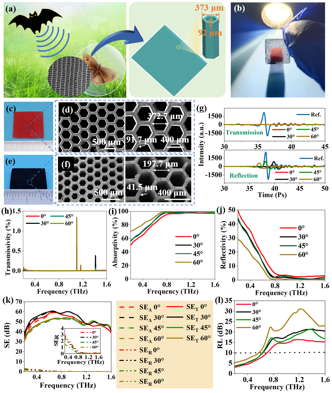 近日,研究团队受自然界中蝴蝶等昆虫翅膀内部蜂窝状微结构的启发,基于3D打印,设计了SiOC陶瓷仿生蜂窝微结构,并成功采用面投影微立体光刻(PμSL)3D打印技术实现了制备。获得的SiOC陶瓷仿生微结构的壁厚小于50μm、结构胞元尺寸小于200μm。测试表明,SiOC陶瓷仿生微结构的最高屏蔽效能(SE)高达64.1dB,从0.2至1.6 THz的透射率低于1.4%。此外,在0.8至1.6 THz范围内,超过97-99.8%的太赫兹波被吸收。以上结果说明研制的SiOC陶瓷仿生微结构具有优异的太赫兹屏蔽性能,在太赫兹电磁波防护器件领域具有创新应用前景。相关研究成果以“3D printed SiOC architecture towards terahertz electromagnetic interference shielding and absorption”为题发表于材料领域顶级期刊、英国皇家化学会期刊《Chemical Engineering Journal》(IF=13.3,https://doi.org/10.1016/j.cej.2024.155689)。