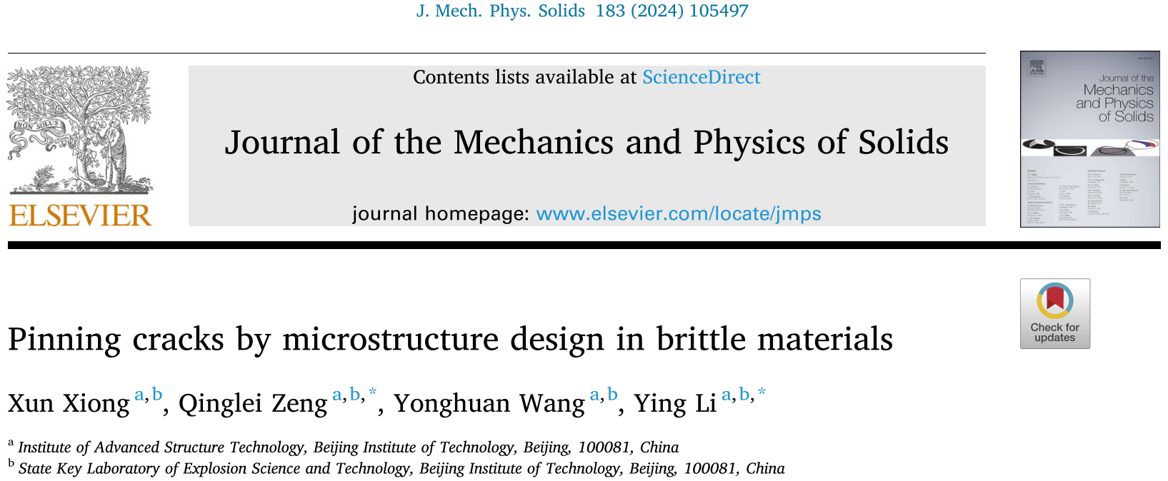 固体材料中裂纹扩展受到微观结构的显著影响,因此微结构设计为调控裂纹扩展路径和等效断裂性能提供了有效途径。近日,固体力学旗舰期刊Journal of the Mechanics and Physics of Solids (JMPS)以“Pinning cracks by microstructure design in brittle materials”为题报道了北京理工大学先进结构技术研究院在脆性材料断裂性能调控领域的最新进展。