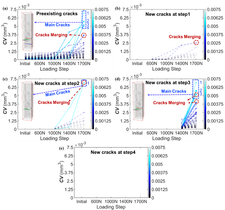 陶瓷基复合材料因其优异的高温力学性能、高比强度、比模量、低密度等特性,被广泛应用于航空航天、能源等热端装备构件上。其优异的性能很大程度上归功于其多尺度的微结构设计,但是这也同样带来了极其复杂的失效行为。此外,在制备过程中引入的内部微缺陷的分布与演化也将极大影响材料在高温、高压等极端服役环境下的失效形式。微裂纹作为其主要的内部损伤形式,量化提取与追踪其演化过程对于深入揭示陶瓷基复合材料的失效机理,保障其服役的安全性至关重要。X射线断层成像技术(CT)与高温加载装置的结合为在位表征材料的损伤演化提供了一种有效的途径。然而,如何从含噪声,低对比的CT表征结果中精确提取特征微弱微裂纹的量化信息,依然是一种挑战。