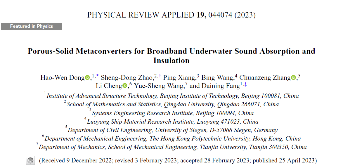 近期,北京理工大学先进结构技术研究院董浩文副教授课题组在水声超表面隐身方面取得新进展。相关成果以“Porous-Solid Metaconverters for Broadband Underwater Sound Absorption and Insulation”为题,在Physical Review Applied上发表[Phys. Rev. Appl. 19, 044074, 2023],被选为“Featured in Physics”(物理亮点),并被Physics以“Metamaterial Provides Underwater Stealth”专题报道。北京理工大学先进结构技术研究院董浩文副教授(一作)、青岛大学赵胜东副教授和北京理工大学方岱宁院士为论文的共同通讯作者,天津大学汪越胜教授、香港理工大学成利院士、德国锡根大学张传增院士、中船系统工程研究院向平研究员、中船725所王兵研究员也参与了该工作。研究获得了国家自然科学基金原创探索计划项目(52250217)的资助。
