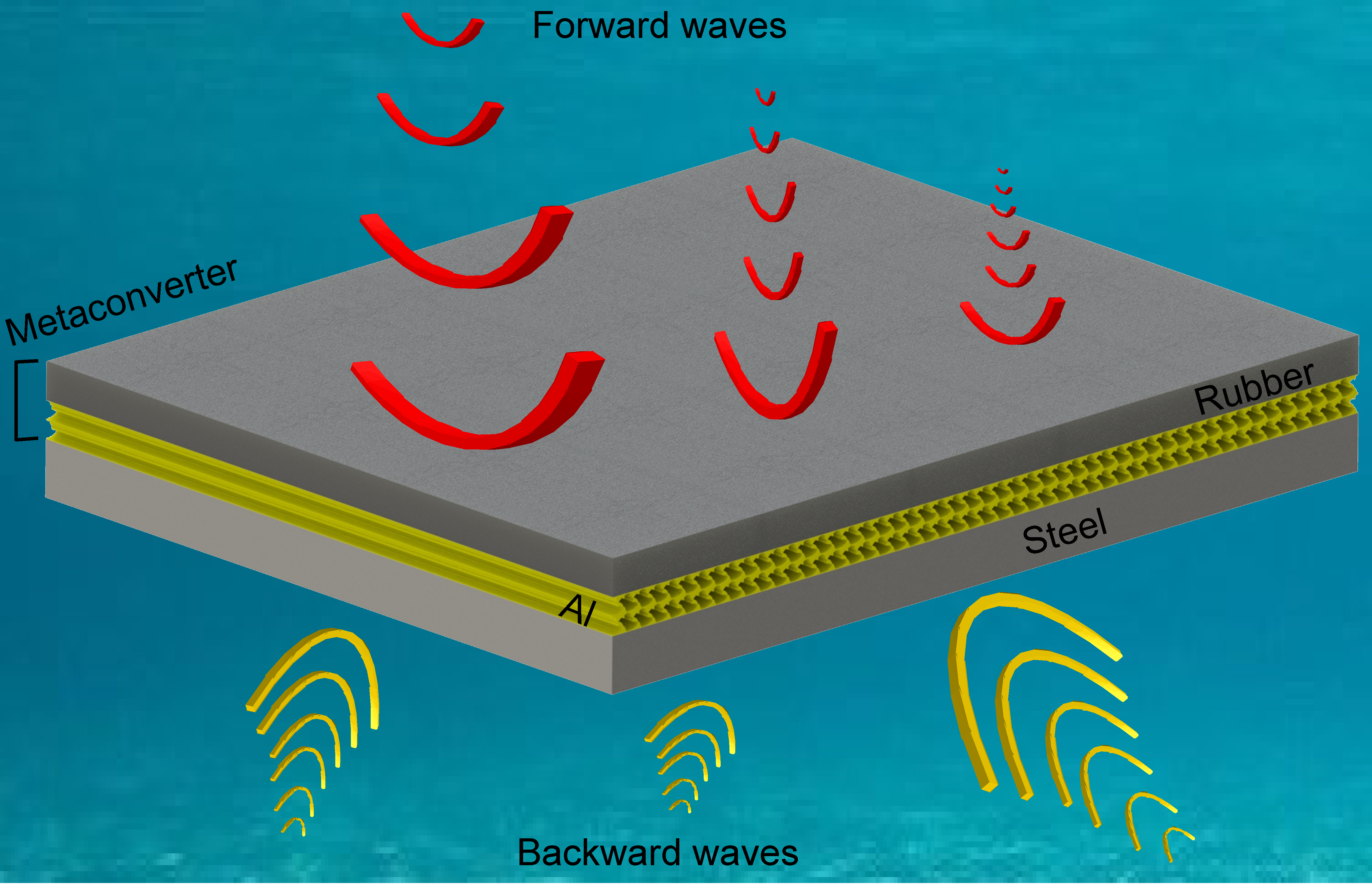 在方岱宁院士先进结构技术学术思想的启发下,针对水下轻薄型宽带吸隔声一体化的挑战,研究团队首次提出了“水声变模超表面”(Underwater acoustic metaconverters)的新概念,建立了由橡胶层与弹性超结构组成的水声变模超表面之弹性波散射理论,详细讨论了超表面模型中纵波-横波模式转换机理,构建了统一、定制化水声变模超表面的拓扑优化设计模型,构造了一种具有强各向异性的水声变模超表面;通过融合多次透射与反射型纵波-横波模式转换效应,再结合橡胶层对弹性波的耗散特性,可以在宽频内同时实现对两个方向入射声波的高效吸收与隔离,从而获得宽带高效吸隔声一体化功能,且整个结构的表观密度(950 kg/m3)小于水,厚度仅为4 cm(见图1)。