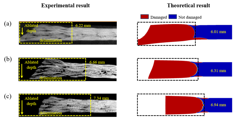 图 5 不同功率下激光烧蚀CFRP的实验和理论模型分层失效结果对比:(a) 942 W;(b) 1256 W;(c) 1884 W。