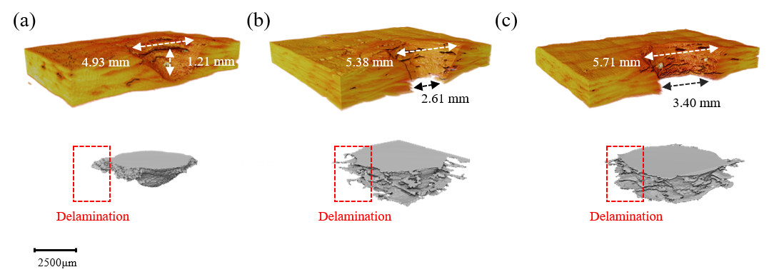 本研究开展了104W/cm2功率密度下CFRPs激光毁伤实验。基于CT扫描与三维几何重构技术,在未烧穿、临界烧穿和完全烧穿三个毁伤状态揭示了CFRPs激光毁伤行为。随着激光功率的增加,局部的烧蚀坑的形状从圆锥形转变为圆柱形。通过CFRPs激光毁伤后内部缺陷的分布情况,本研究探究了高能激光打击复合材料的热-力-化影响区域(热解层和炭化层)随激光能量密度的演化规律。
