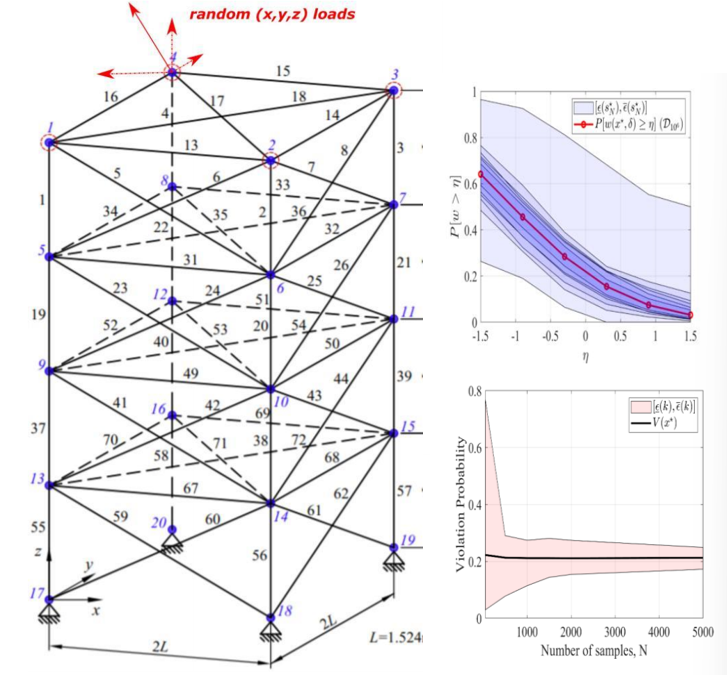 基于上述方法,文章还研究了一种数据驱动的场景可靠性优化方法,如图3所示,提出的场景可靠性优化方法消除了不确定优化问题对松弛变量和拉格朗日乘子依赖性,通过分析精确微分罚函数对每个约束的灵敏度值大于零的约束数量,则可确定支持(积极)约束数量,最终可得到多源不确定优化问题的结构失效概率和可靠性,利用有限样本场景便可得到约束违反边界,获得约束违反程度的不确定度量区间,消除传统可靠性优化问题双层嵌套循环中的内层循环,从而实现可靠性分析与确定性优化解耦,将传统可靠性双层优化问题转变成单层优化问题,图4给出了72杆空间桁架结构工程应用案例。