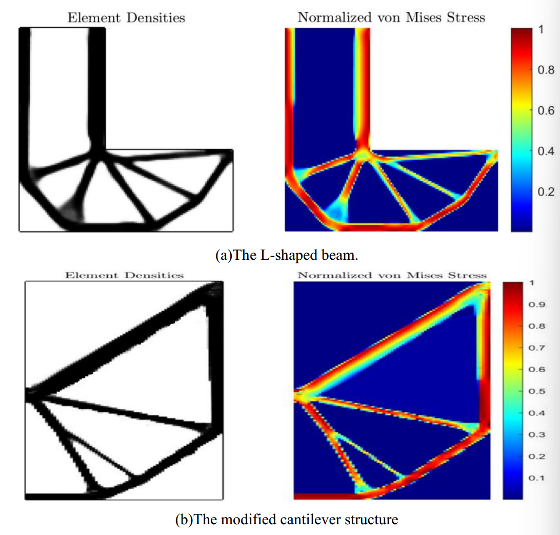文章提出如图1所示的激活函数和损失函数,通过构造等式和不等式约束泛函模型处理标准优化问题等式约束和不等式约束,建立一种可微精确微分惩罚函数方法,并从数学上证明了方法的精确性,得到了不依赖于对偶和松弛变量的约束优化问题最优性条件,研究表明构造的等式和不等式泛函关于约束的导数即是传统拉格朗日乘子,此外,研究发现,二阶Hessian矩阵包含与目标和约束函数相关的一阶导数项,通过研究应力约束拓扑优化两个算例验证了提出的算法在复杂约束优化问题中的可行性,如图2所示。