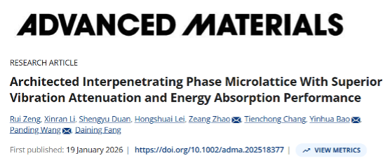 北京理工大学先进结构技术研究院王潘丁副教授、赵则昂副教授和上海大学鲍垠桦副教授联合团队:互穿微纳点阵结构实现高振动衰减与能量吸收随着微纳制造技术的飞速发展,微纳点阵材料凭借其独特的尺寸效应和拓扑设计,在超轻质、高比强度及能量吸收等力学性能方面展现出巨大潜力。然而,传统单材料体系受限于固有属性,难以实现性能的突破性提升或多功能集成。尽管互穿复合材料(IPCs)通过多相协同在宏观尺度实现了强度与韧性的提升,但其在微纳尺度的制备仍面临技术瓶颈。因此,如何将微纳点阵的几何优势与IPC的多相耦合机制深度融合,实现力学性能与功能特性的协同调控,已成为新一代智能材料设计的核心挑战。探索微纳尺度多材料架构的创新制备方法,不仅有望突破现有材料性能极限,还将为航空航天、柔性电子等领域提供全新的解决方案。 近日,北京理工大学先进结构技术研究院王潘丁副教授、赵则昂副教授和上海大学鲍垠桦副教授联合团队合作提出了一种基于表面张力驱动的双聚合物互穿微纳点阵结构制备方法,该两相结构实现了517.19%的平台应力提升与优异的比强度和比吸能,同时展现出76.3%的振动频率衰减范围和31.5 dB的传递率峰值损耗。研究成果以“Architected Interpenetrating Phase Microlattice With Superior...2026.02.06 -